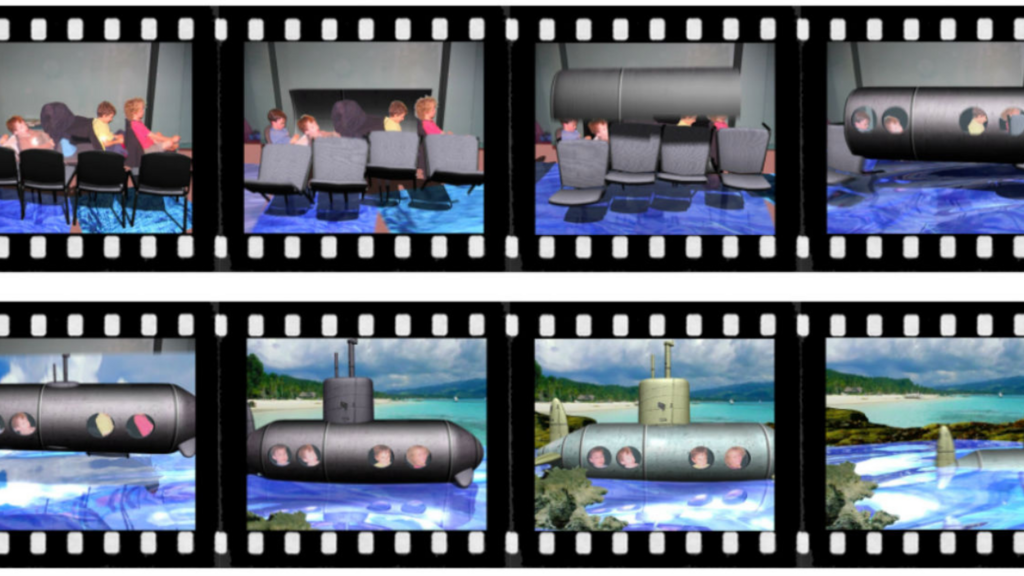 In the third image of four more children in the same early childhood programme, the four pre-schoolers are sitting on four chairs pretending to be under the sea. This time I work with an animator who listens to their story and depicts chairs taking on a life of their own, changing through movement into a tubular submarine.