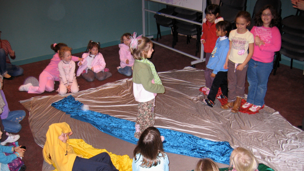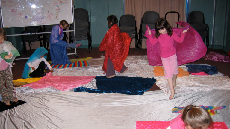 For instance, in the following two images of children in a early childhood program I ran in 2002, they’re playing with a frequently used prop of coloured material to define a storytelling space.
