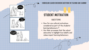 The dog in our cartoon may have been taught, but was it motivated to learn? Motivation is the engine of learning, and this section encourages a discussion on the cultural and personal values that influence a student’s desire to engage. How does the school actively foster an environment where students want to learn?